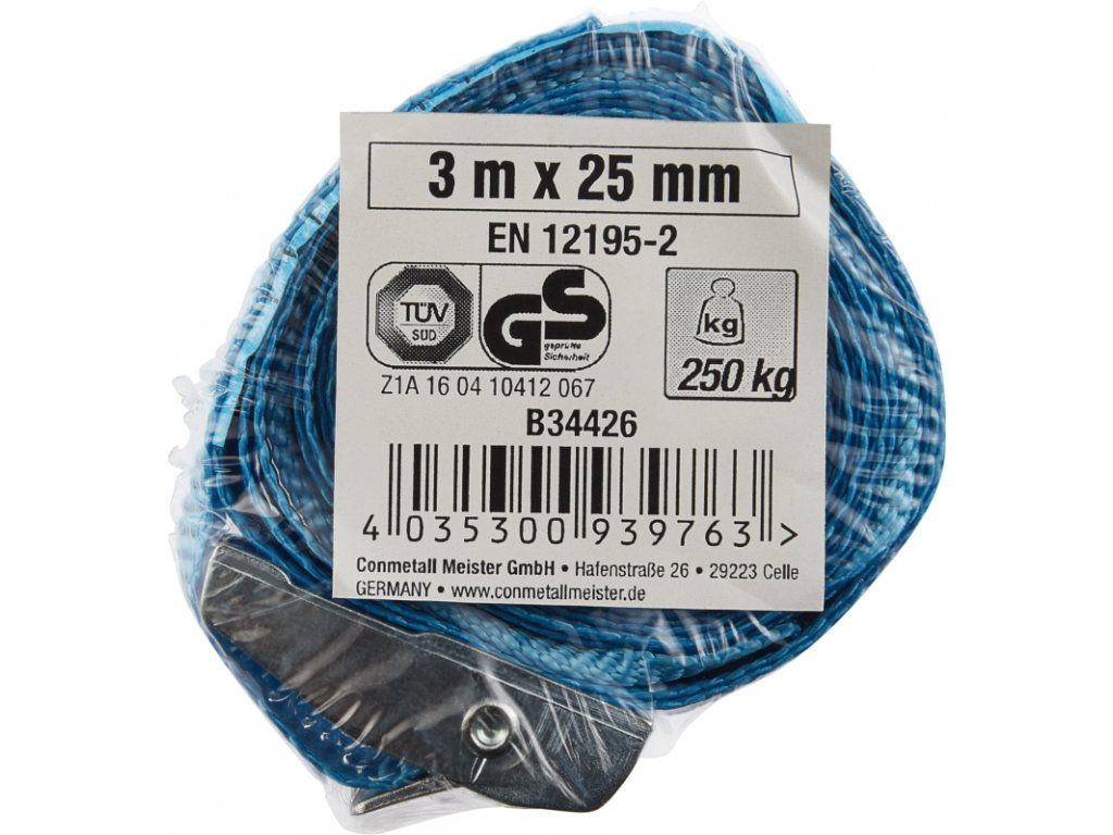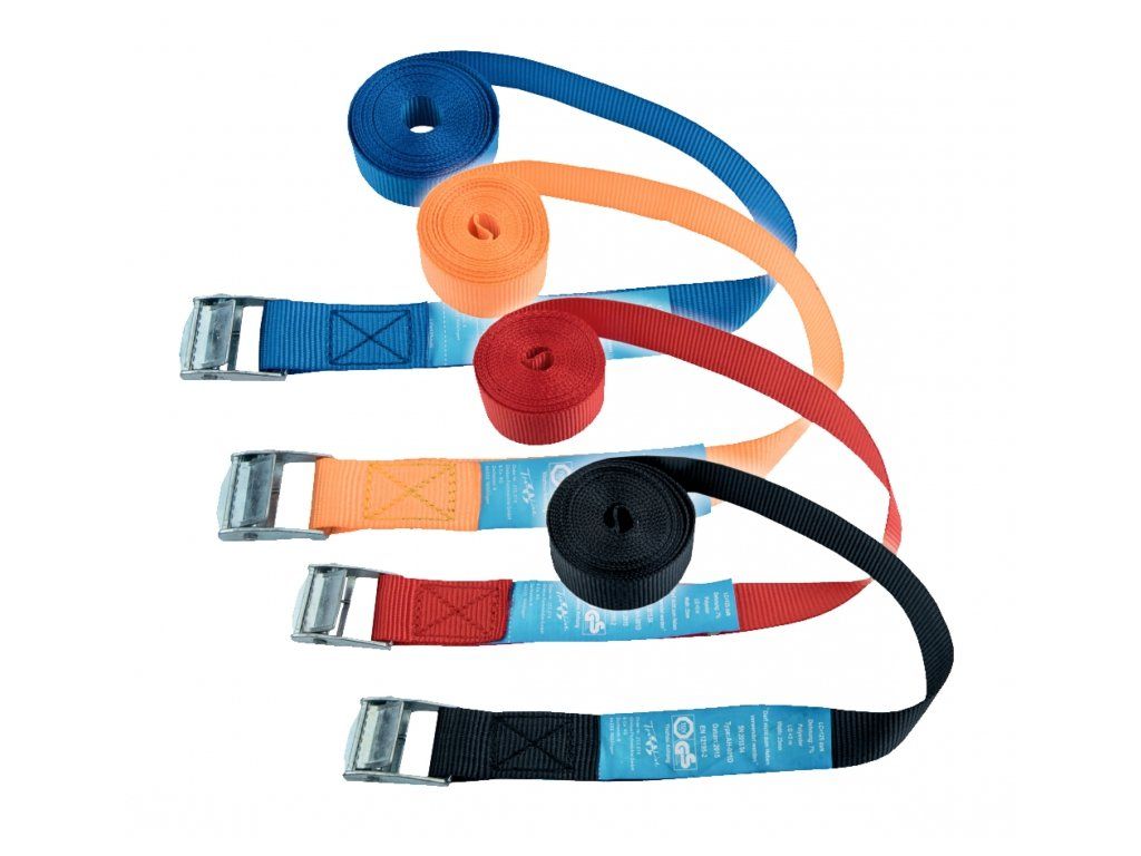 Stahovací pásky 25mm, 3m, s přezkou, materiál: polyester, LC páska: 250 daN ~ kg, vyrobeno na základě EN 12195-2, certifikát TÜV/GS, maximální protažení 7%, barevné varianty: černá, oranžová, červená, modrá