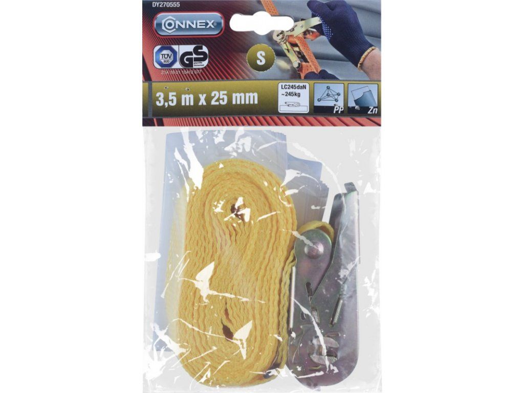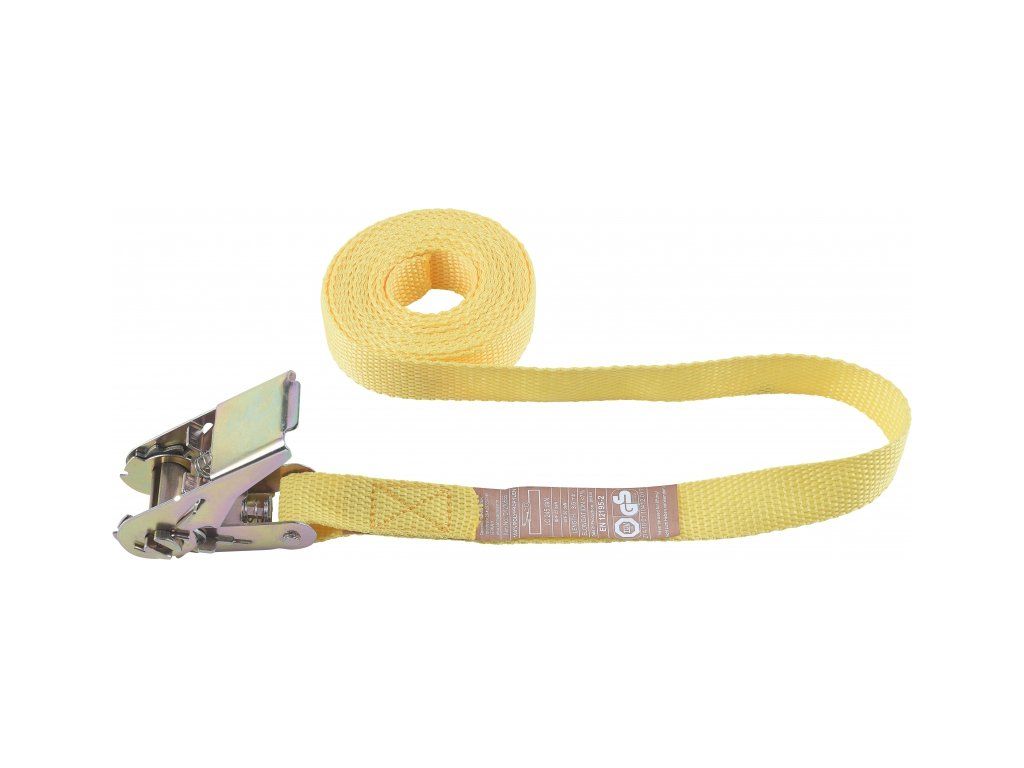 EN12195-2 (LC) pevnost v tahu: 245 daN~kg, (STF) standardní předpínací síla: 50 daN~kg, (SHF) standardní ruční předpínací síla: 25 daN~kg, maximální prodloužení: 7 %, polypropylen, schváleno TÜV/GS, velikost S (1 daN ~ 1 kg).