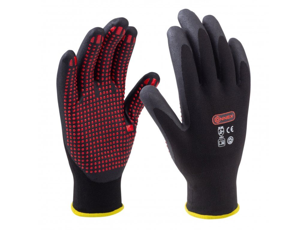 Jemný úplet z polyamidu s nitrilovým povrchem a nitrilovými výstupky na dlani, hřbet ruky částečně potažený, povrchová úprava odolná proti kapalinám, dobrý cit pro dotek, nitrilové výstupky na dlani nekloužou a zajišťují optimální úchop i na hladkých površích, pro středně náročné práce vyžadující citlivost. Oblasti použití: např. dílna, přesná mechanika. EN ISO 21420, EN 388