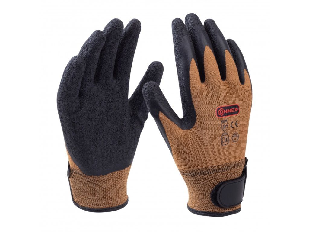 Jemné pletené rukavice z nylonu se smršťovací latexovou vrstvou na vnitřní straně ruky, se suchým zipem, citlivé, bezpečné uchopení, pružné, bezpečné držení.