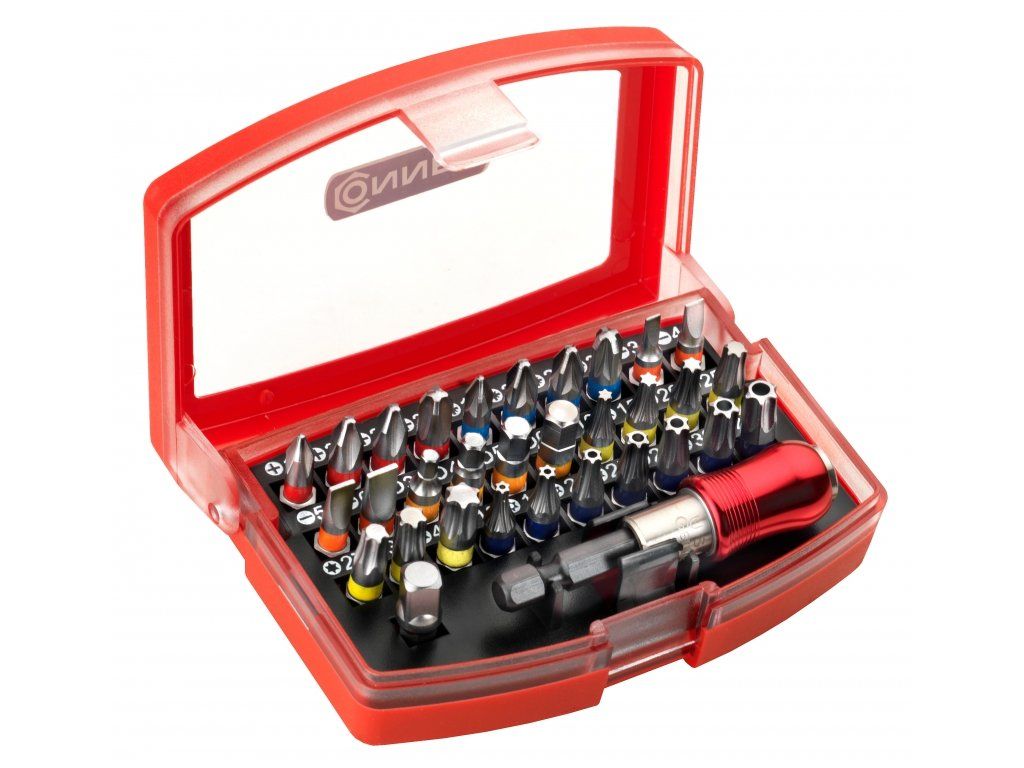 sada magnetických bitů s držákem, 32 dílů, bity z křemíko-molybdenové oceli (S2) v profesionální kvalitě, s pohonem 1/4“, systém barevného značení pro snadný výběr bitů, patentovaný držák bitů se silným magnetem a rychovýměnnou upínací hlavou, v plastovém rozkládacím pouzdře s průhledným víkem,