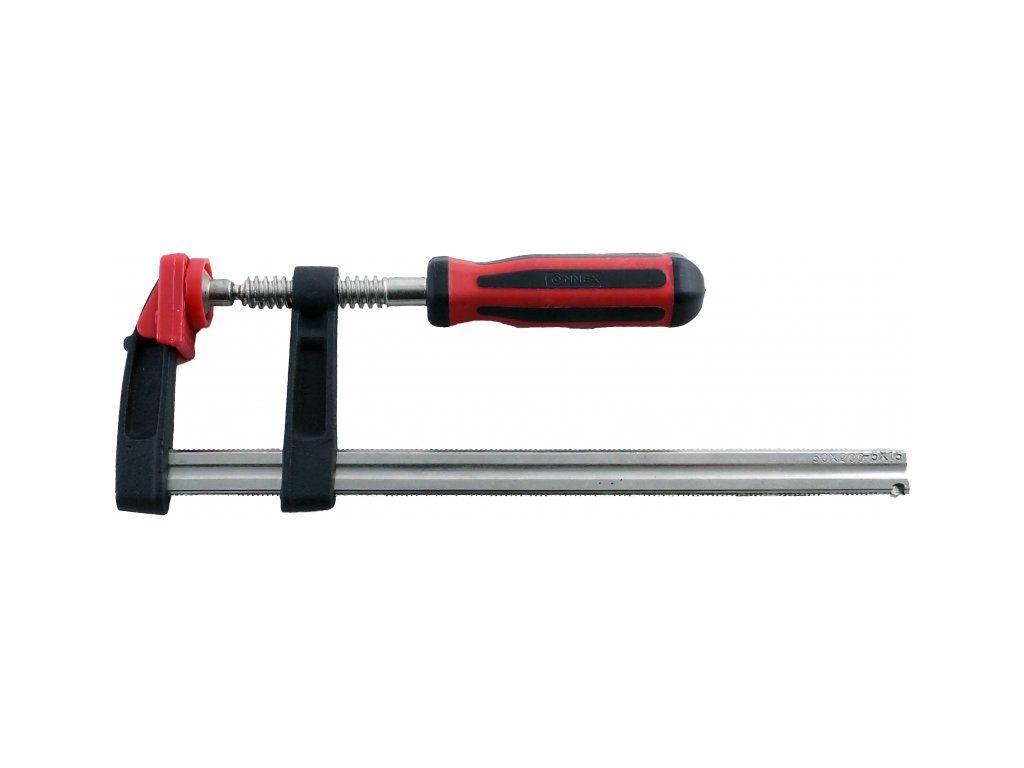 Vyrobeno z temperované litiny, s niklovou profilovanou ocelovou kolejnicí (ocel C45) 15 x 5 mm, přítlačná deska s plastovou ochranou, poniklované vřeteno, dvousložková rukojeť